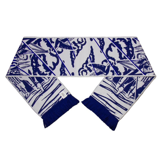 Tätstickad halsduk med ett mönster av ikonen, använd på matchdag för att visa de blåvita färgerna eller häng upp den på väggen!