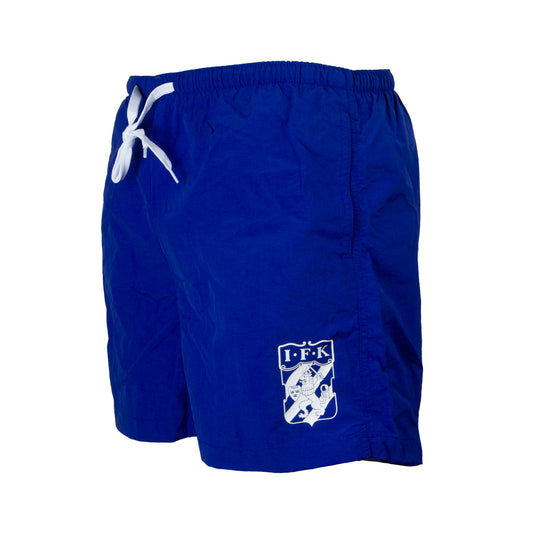 Blåa badshorts i klassisk herrmodell med tryckt klubbmärke på vänster ben. Badshortsen har mudd i midja med dragsko för individuell passform. Två öppna sidofickor och innerbyxa i mesh för extra bekvämlighet.