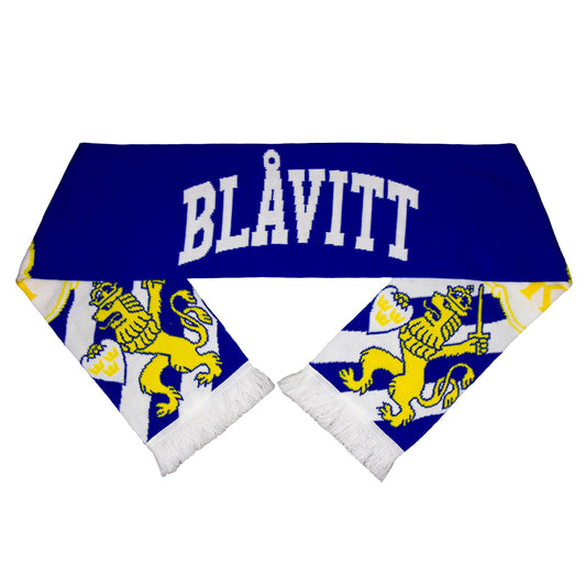 Stickad halsduk i blått med stora klubbmärken samt texten Blåvitt instickat i mitten.