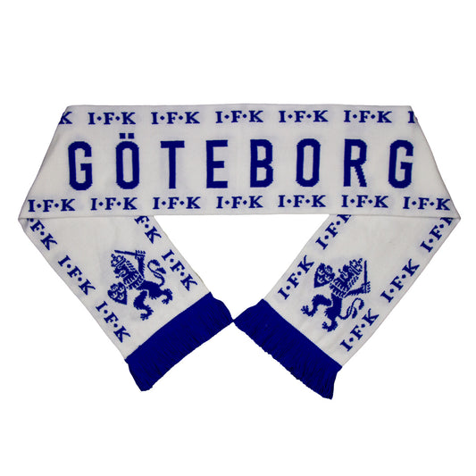 Stickad halsduk i vitt med blåa detaljer, halsduken har lejon i vardera ände samt texten IFK och Göteborg.