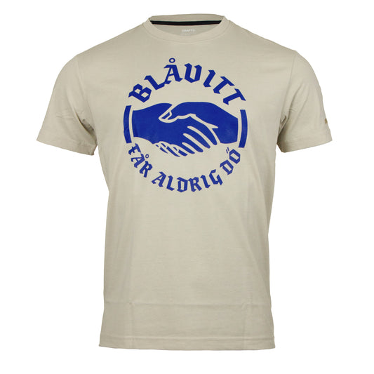 Beige t-shirt i unisexmodell med stort tryck över bröstet av ikonen som återfinns på 2025 års matchröja med texten "Blåvitt får aldrig dö". T-shirten är gjord i en mjuk blandning av ekologisk bomull och återvunnen polyester som ger hög komfort. Den sportiga designen gör att t-shirten passar alla tillfällen - lika bra till vardags som på matchdagen!