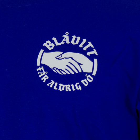 Blå t-shirt i unisexmodell med mindre tryck på bröstet av ikonen som återfinns på 2025 års matchtröja med texten "Blåvitt får aldrig dö". T-shirten är gjord i en mjuk blandning av ekologisk bomull och återvunnen polyester som ger hög komfort. Den sportiga designen gör att t-shirten passar alla tillfällen - lika bra till vardags som på matchdagen!