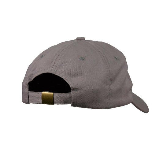 Grå keps i klassisk modell med broderad text på framsida, kepsen kan justeras i storlek baktill.