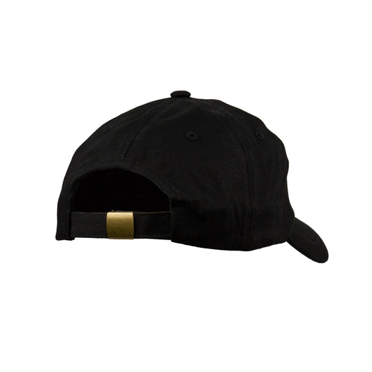Svart keps i klassisk modell med broderad text på framsida, kepsen kan justeras i storlek baktill.