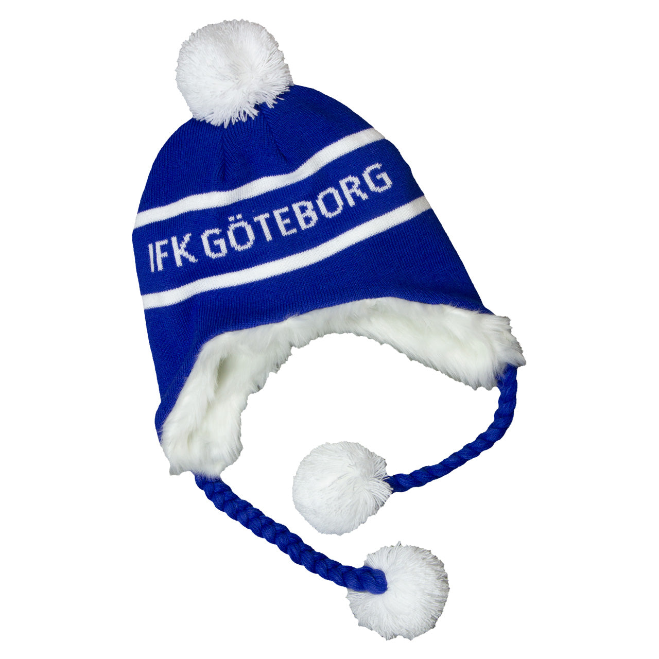 Stickad öronlappsmössa för junior med fuskpäls och dekorativa tofsar. Designad i klubbens blåvita färger och präglad med texten "IFK Göteborg" på sidorna. Mössan har ett värmande innerfoder, perfekt för kalla dagar på läktaren. Finns även i vuxen-modell.