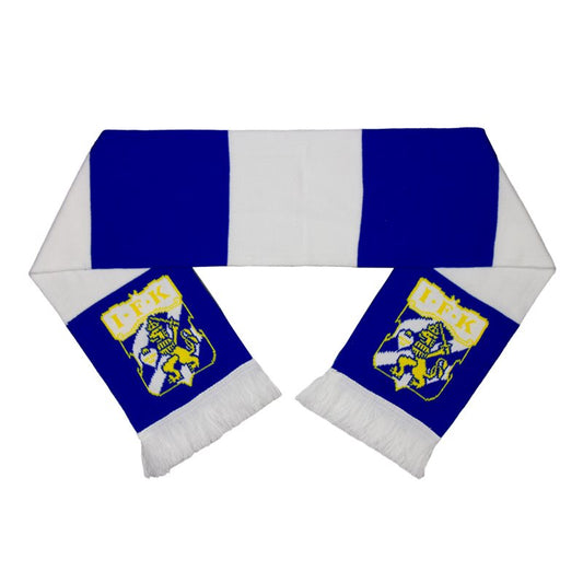 Stickad blåvit halsduk med stora klubbmärken samt fransar. Halsduken är en kortare modell och passar därför utmärkt till våra mindre supportrar.