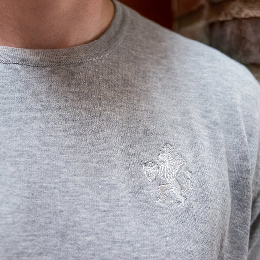 Rundhalsad, finstickad tröja i herrmodell, broderad med ett grått lejon på vänster bröst för en diskret, stilren känsla. Ribbstickad i nederkant och ärmavslut samt dubbelvikt slätstickad kant i ringningen.