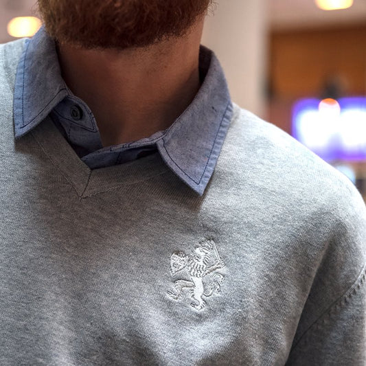 Finstickad tröja i herrmodell med v-ringad hals, broderad med ett grått lejon på vänster bröst för en diskret, stilren känsla. Ribbstickad i nederkant och ärmavslut samt dubbelvikt slätstickad kant i v-ringningen.