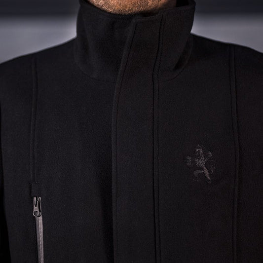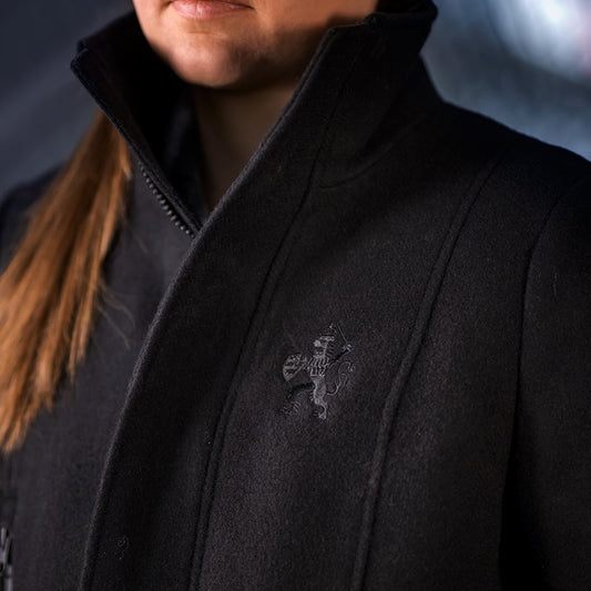 Stilren ullkappa i dammodell, broderad med ett svart lejon på vänster bröst för en diskret känsla.