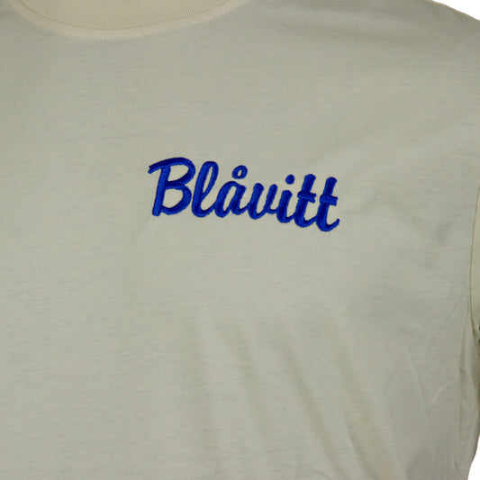Beige t-shirt med texten Blåvitt i brodyr på bröstet.