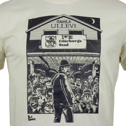 En beige t-shirt med svart tryck som passar lika bra på läktaren som i vardagen.