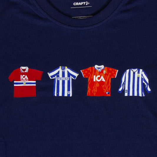 Marinblå t-shirt från Craft med print på bröstet föreställandes fyra av IFK Göteborgs matchtröjor från de gångna 100 åren.