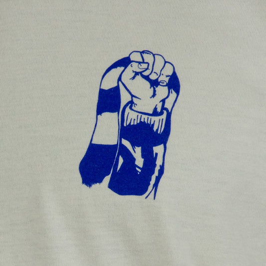 T-shirt i off-white i herrmodell, t-shirten har ett litet tryck på vänster bröst i marinblått föreställandes en knuten näve med en blåvit halsduk. Motivet är designat för hand av Sebastian Eriksson som även har designat höstens uppvärmningströja som används av A-lag Dam och Herr under resterande av säsongen 2024.