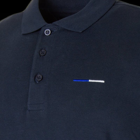 Marinblå klassisk bomullspiké med sidslits och knappar som går ton-i-ton, stilren brodyr på vänster bröst i form av en blåvit rand.